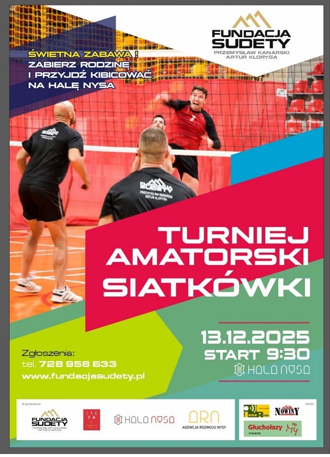 Fundacja Sudety serdecznie zaprasza wszystkie dzieci - niezależnie od wieku, poziomu umiejętności czy sportowego doświadczenia - na wyjątkowy Amatorski Turniej Siatkówki, który odbędzie się 13 grudnia 2025 roku o godz. 9:30 w nowoczesnej Hali Nysa przy ul. Sudeckiej 23.